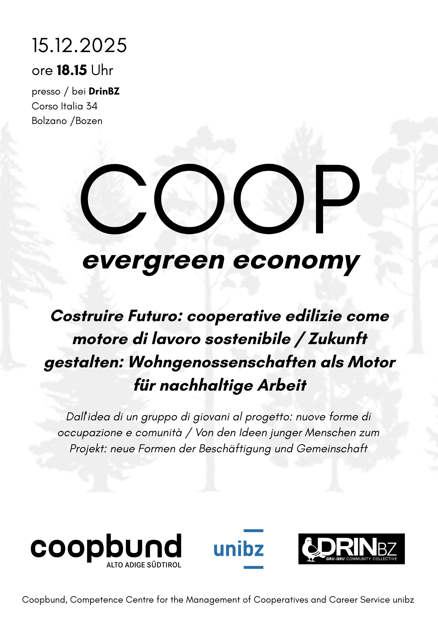 In collaborazione con il Career Service della Libera Università di Bolzano e con DrinBZ | Community collective di Bolzano, Coopbund organizza un incontro dedicato alla creazione di cooperative che generano spazi abitativi innovativi e nuove opportunità di lavoro.